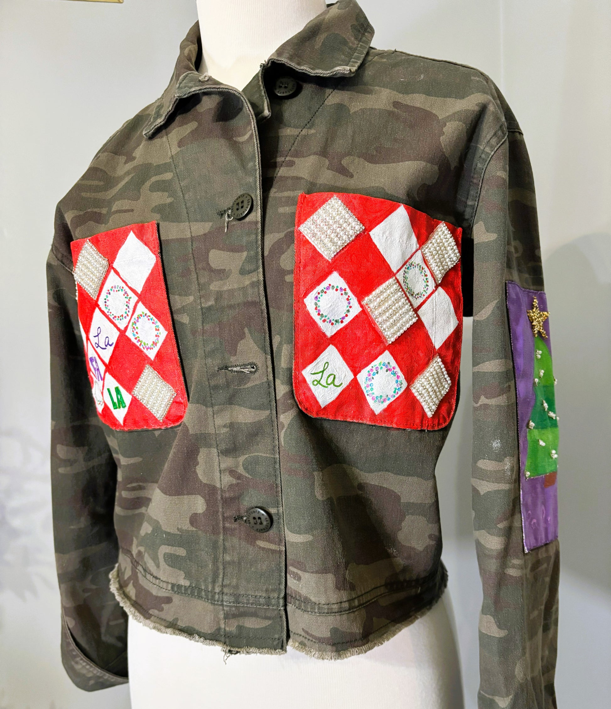 Camo hand painted upcycled Christmas Jacket with crystal details. Utility jacket, long sleeve, double front chest pockets, asymmetrical button closure. Sits at waist.