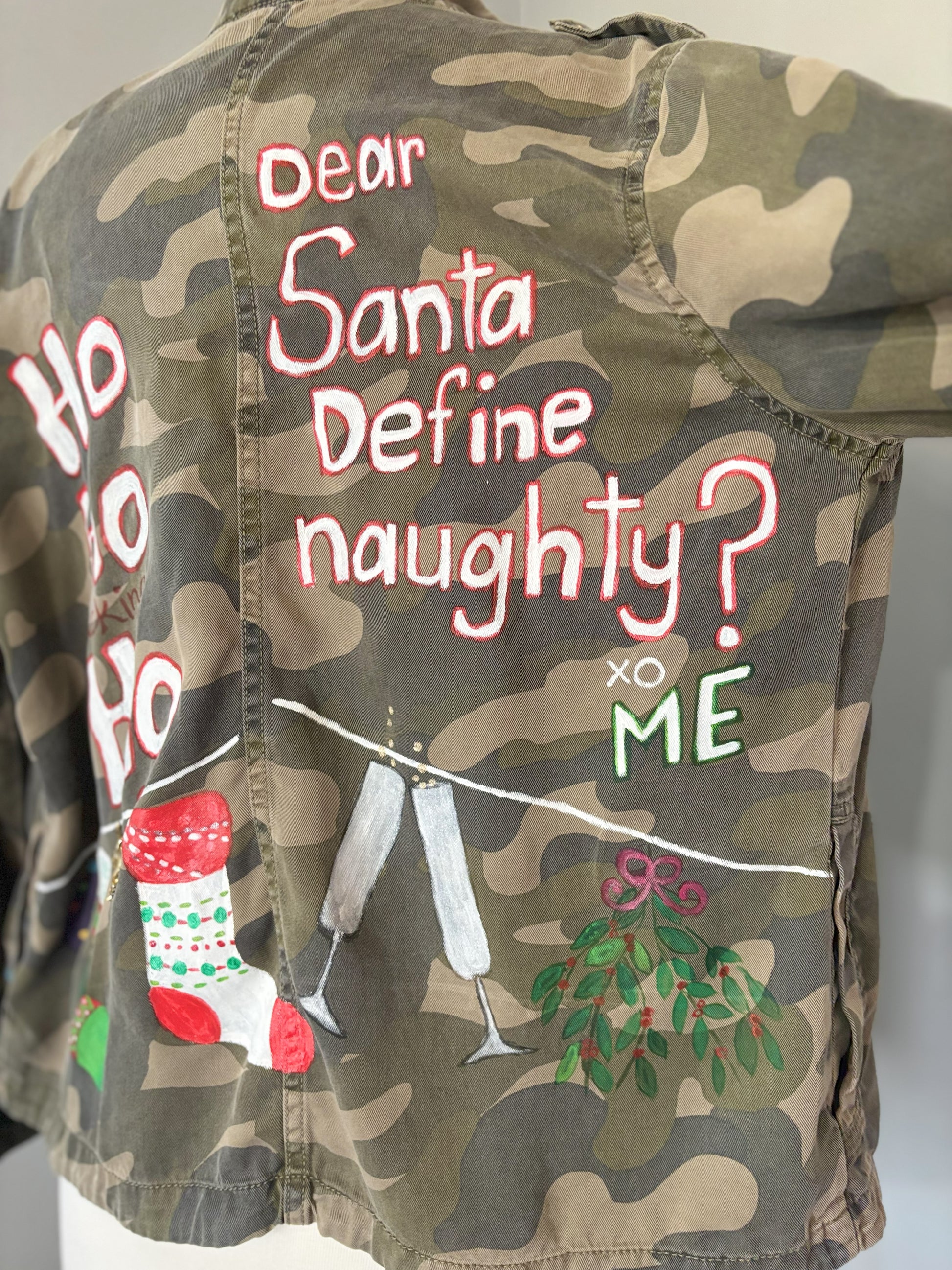 Camo hand painted upcycled Christmas Jacket. Utility jacket, long sleeve, front chest pockets, side vent pockets with drawstring waist, button and zip closure.